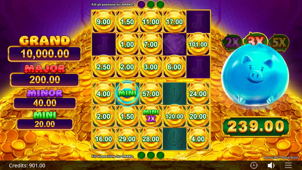 Smash your way to fortunes with AreaVegas Games’ latest slot release, Area Link™ Bank Blast! Four colorful piggy banks—Purple, Red, Blue, and Green—are bursting with treasure, just waiting for you to crack them open. Each spin can activate the Area Link™ feature, where Coins collect in their matching piggy banks and unleash thrilling Piggy Bank Upgrades. Keep an eye out for the Green Coins, which instantly collect all Gold Coins on screen, or the Blue Coins, which boost the value of random Gold Coins multiple times! With 3 respins and multipliers of 2x, 3x, or 5x up for grabs, this game is packed with explosive potential. Fill all reel positions and you’ll blast your way to the GRAND jackpot! Spin your way to wealth—one piggy bank at a time!