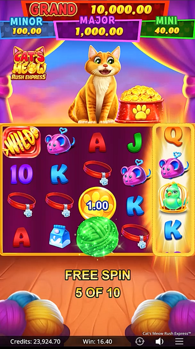 Welcome to the ultimate kitty playground, where fortune is just a paw’s reach away! Cat’s Meow Rush Express™ blends the warmth of a cozy home with the thrill of feline antics. The reels are alive with charming cat-themed symbols, fluffy yarn balls, and gleaming gold accents that add a touch of magic. Soft textures and rich colors create a playful yet sophisticated atmosphere, inviting players into a world where every spin feels like a cat’s curious adventure.