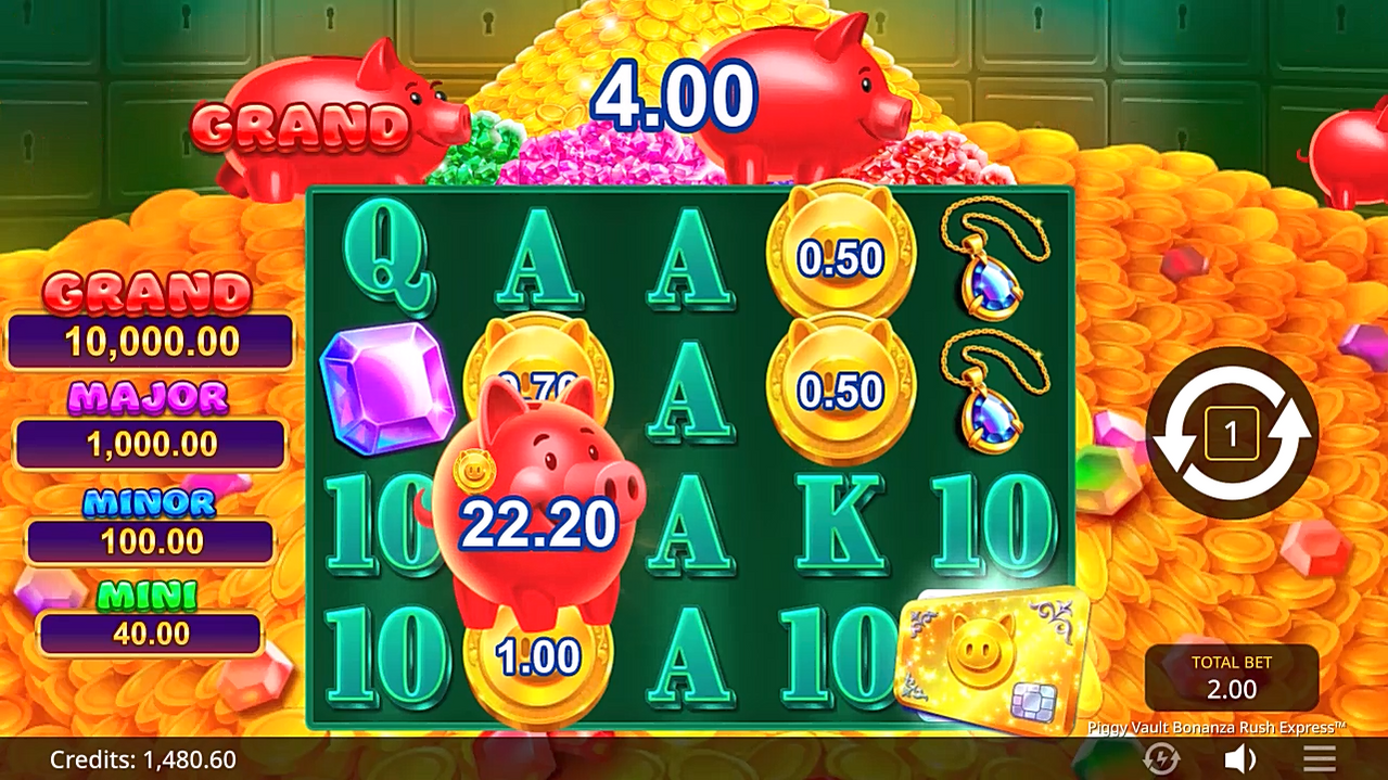 Step into a world of cheerful riches with Piggy Vault Bonanza Rush Express™, where reels are adorned with banks, colorful gems, diamonds, and money symbols, all set against a glittering mound of gold coins. Piggies appear among the treasures, guiding players through a playful journey of collection and accumulation. The art direction emphasizes visual delight and clear thematic cues, making the vault’s growing rewards the centerpiece of the experience.